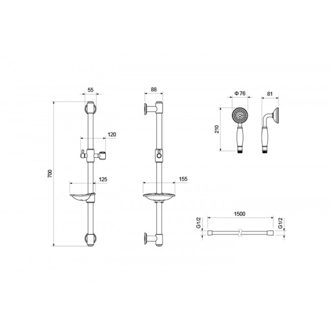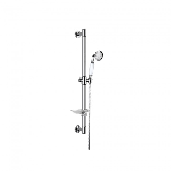 | Комплектация | 1. Душевая штанга 2. Держатель душевой лейки из латуни 3. Душевая лейка 4. Душевой шланг 5. Мыльница 6. Монтажный комплект |
