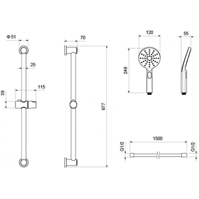 | Комплектация | 1. Душевая штанга 2. Держатель душевой лейки 3. Душевая лейка 4. Душевой шланг 5. Монтажный комплект |