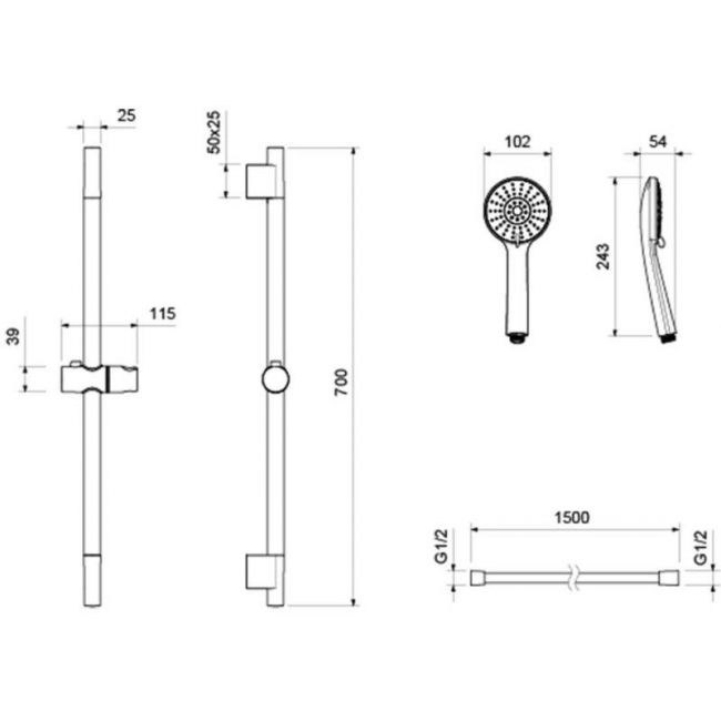 | Комплектация | 1. Душевая штанга 2. Держатель душевой лейки 3. Душевая лейка 4. Душевой шланг 5. Монтажный комплект |