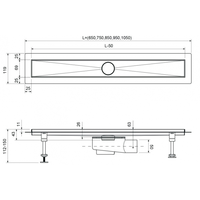 Система водоотведения из нержавеющей стали в комплекте с декоративной вставкой, поворотным сифоном, регулируемыми ножками, дополнен сухим барьером. В цвете "полированная сталь".