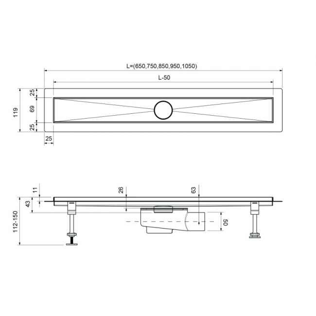 Система водоотведения из нержавеющей стали в комплекте с декоративной вставкой, поворотным сифоном, регулируемыми ножками, дополнен сухим барьером. В цвете "полированная сталь".