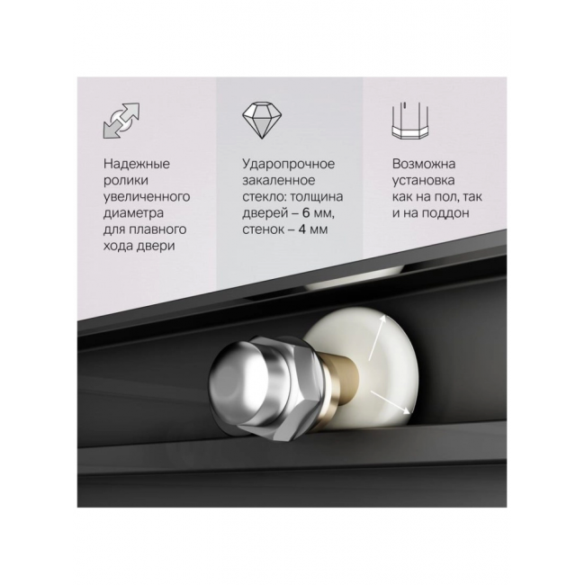 прочная конструкция с двойными стальными роликами для плавного хода двери и закаленным стеклом;