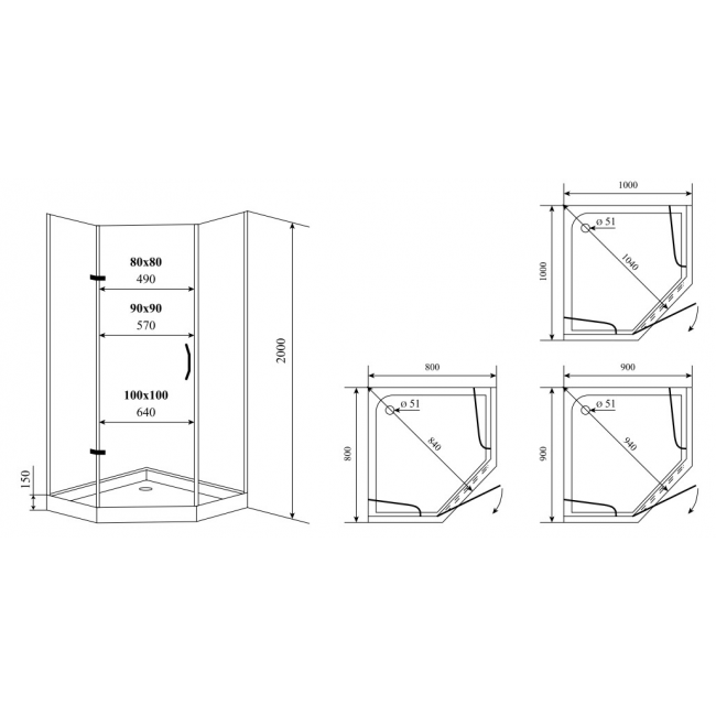 акриловый пятиугольный поддон с сифоном и усиленным каркасом;