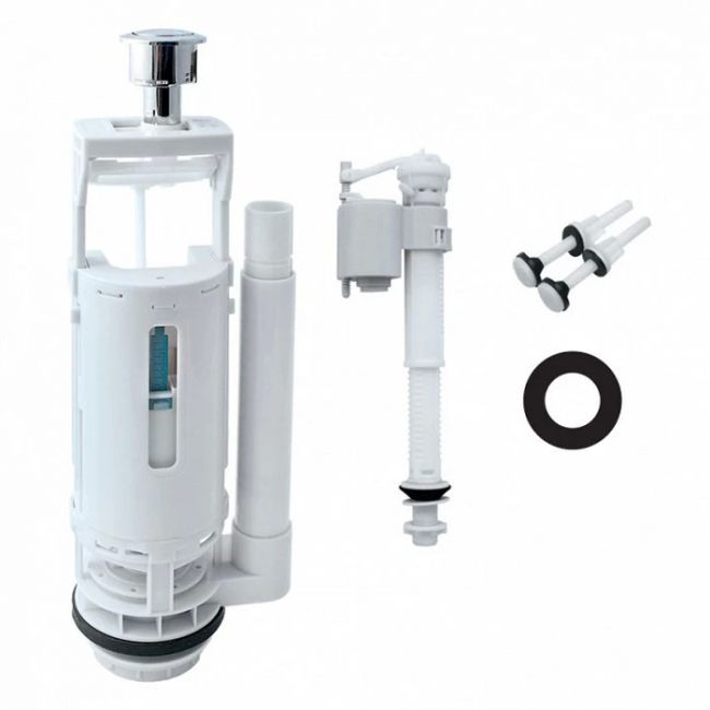 Двухуровневая арматура с нижним подводом воды (тип А). Комплектация: Круглая резиновая прокладка, пластиковые крепления-болты (2 шт.), паспорт изделия. Все подвижные части находятся внутри защитного корпуса и изготовлены из высококачественного пластика. Гарантия 7 лет.