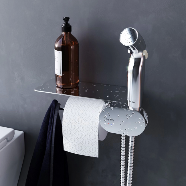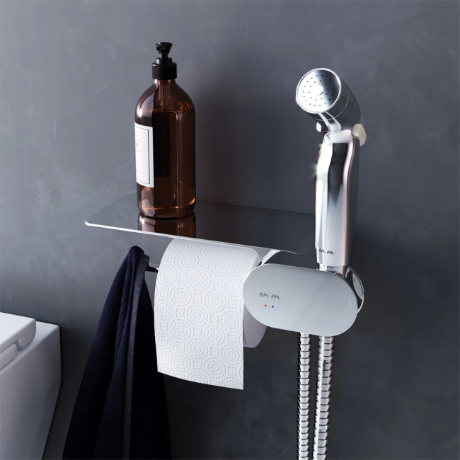 Самый широкий спектр возможностей с многофункциональным смесителем от АМ.РМ! Смесительоснащен прогрессивным картриджем движение которого происходит в одной плоскости делаяуправление максимально комфортным.Гигиенический душ зафиксирован непосредственно в самом смесителе что экономитпространство. Чтобы включить смеситель достаньте гигиеническую лейку и поворотом еедержателя включите устройство. При нажатии на специальную кнопку на самой лейке начинаетсяподача воды.Весь продукт представляет собой удобную полочку на которой можно разместить все чтонеобходимо вам под рукой. На интегрированном держателе можно размещать туалетную бумагу а на крючке - полотенце.