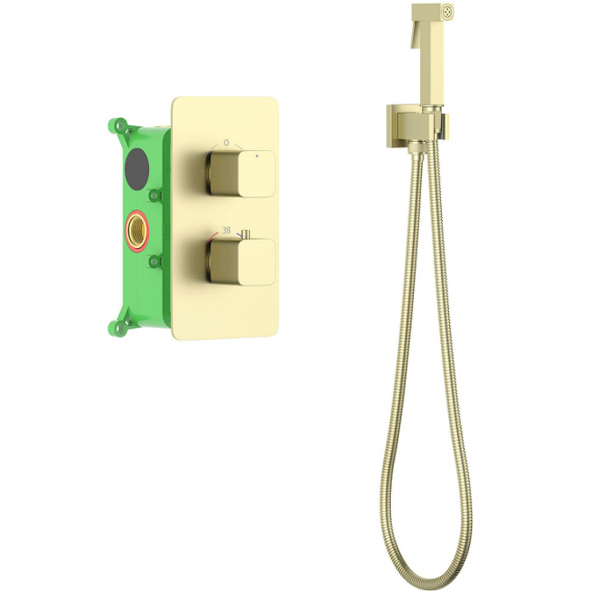 Цвет "матовое золото" никогда не выйдет из моды, во все времена драгоценный металл был признаком богатства. Встраиваемый смеситель с гигиеническим душем и термостатом Timo Petruma 5089 предназначен для монтажа в твердой или полой стене. Основные преимущества встроенного смесителя: элегантный внешний вид, все коммуникации и крепления спрятаны в стену, снаружи видны только декоративные элементы. Установить встроенный смеситель можно в любом месте. Регулировка температуры воды осуществляется ручкой термостата (расположена снизу), термостатический картридж поддерживает стабильную температуру воды. Управление смесителем осуществляется поворотом ручки (расположена сверху) влево. В положении верхней ручки 12:00 смеситель выключен. Длины шланга 1,2 метра хватает для решения гигиенических задач. Можно также использовать например, для мытья собаки после прогулки или наполнения ведра воды и т.д. Смеситель отлично сочетается с инсталляцией для унитаза. Сложностей монтажа не возникает при установке смесителя опытным сантехником.