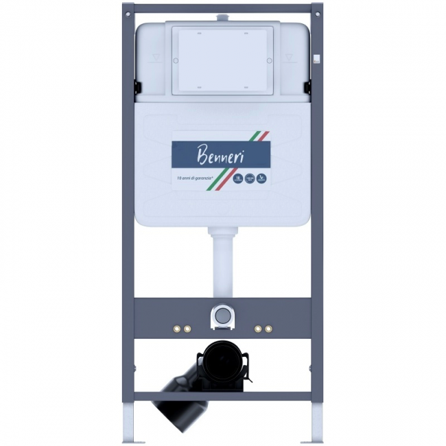 • инсталляции Benneri BE.53113.01. Это прочная монтажная рама из стального профиля 40*40 мм толщиной 1.5 мм и шириной 53 см, с усиленной траверсой толщиной 3мм. Инсталляция способна выдерживать нагрузку более 400 кг. Цельнолитой бачок скрытого монтажа, обшитый кожухом из пенопласта, защищает от конденсата и исключает возможность проточек.
