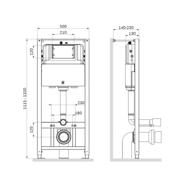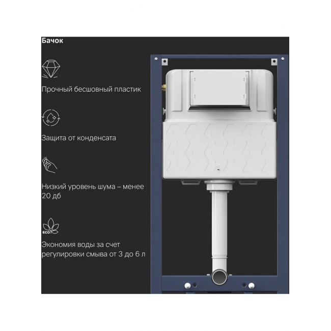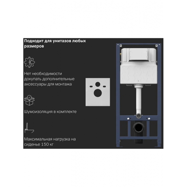 благодаря вертикальным ребрам жесткости инсталляция универсальная и подходит для унитазов любых размеров, включая унитазы с небольшой контактной поверхностью;