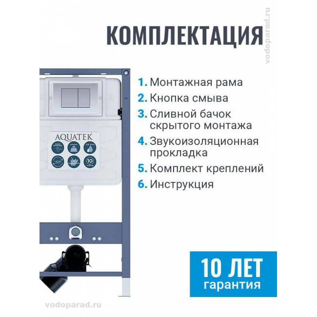 В комплекте есть все необходимое для установки инсталляции и подсоединения унитаза. К инсталляции Aquatek Pneumo S50 подходят только клавиши Aquatek для пневматического управления.