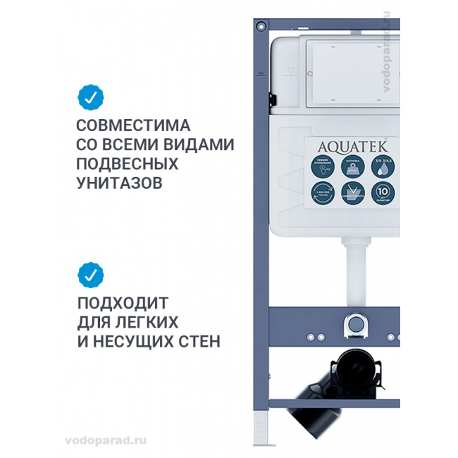 В комплекте есть все необходимое для установки инсталляции и подсоединения унитаза. К инсталляции Aquatek Pneumo S50 подходят только клавиши Aquatek для пневматического управления.