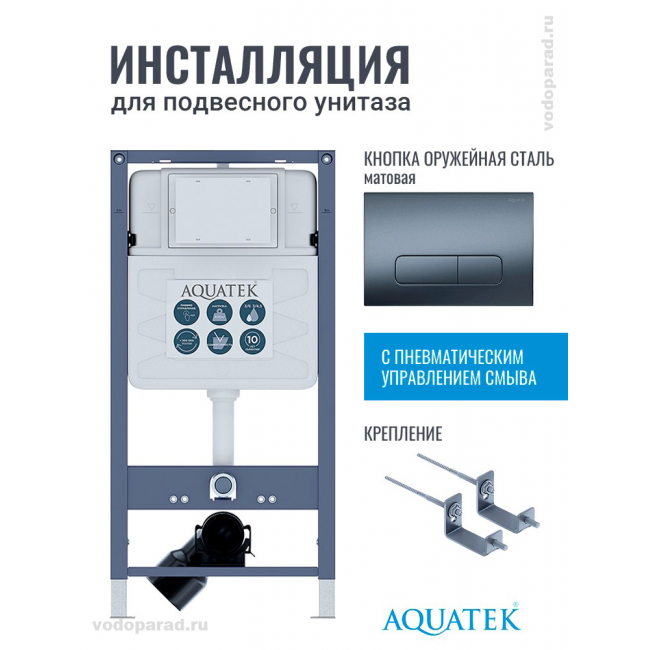 Инсталляция для подвесного унитаза Aquatek Pneumo S50 INSP01.KKI02.PNS09, кнопка смыва оружейная сталь + крепеж купить с доставкой. 100% Оригинал. Гарантия!