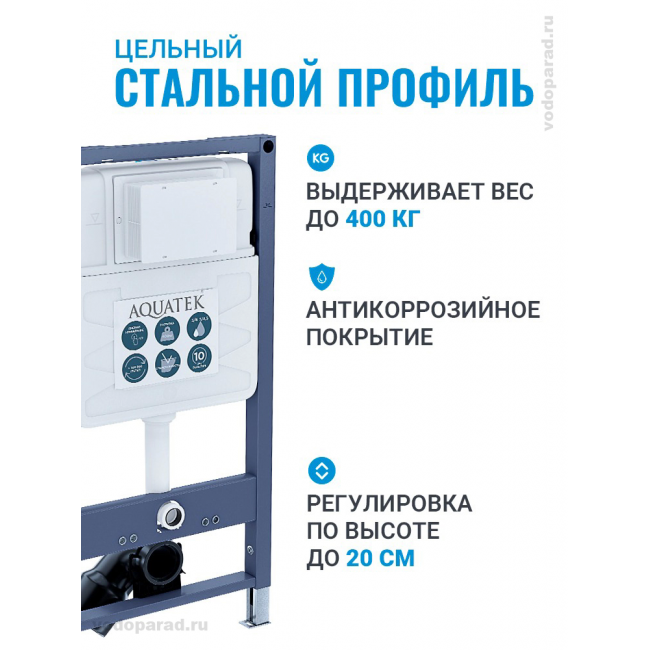 Монтажная рама изготовлена из цельного стальной профиль 40x40 мм толщиной 2 мм с антикоррозийным порошковым покрытием, выдерживает нагрузку до 400 кг. Надежная сливная арматура бачка рассчитана на 200 000 циклов использования.