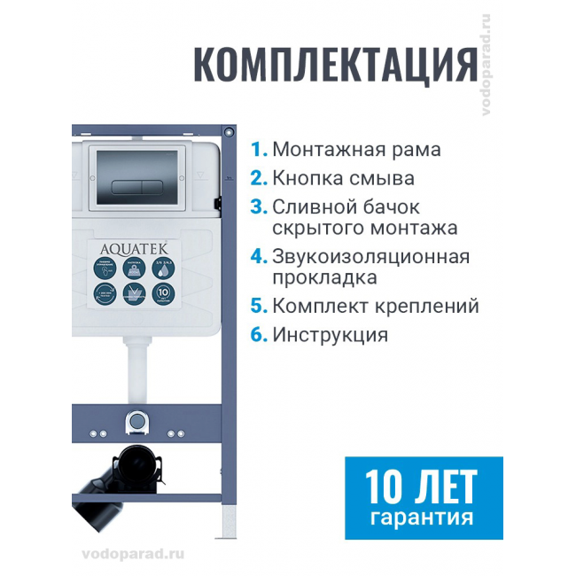В комплекте есть все необходимое для установки инсталляции и подсоединения унитаза. К инсталляции Aquatek Pneumo S50 подходят только клавиши Aquatek для пневматического управления.