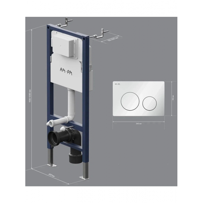 Инсталляция для подвесного унитаза бренда AM.PM коллекции PrimeFit с механическим управлением смыва включает в себя максимально полный комплект поставки: крепления, патрубки, звукоизолирующую прокладку, механическую двухрежимную клавишу смыва. Размер инсталляции(Ш/Г/В): 530x150-200x1130-1230 мм. Размер клавиши (Ш/Г/В): 240x10x162 мм. Цвет и материал: синий каркас из нержавеющей стали, белый бачок из ABS-пластика, механическая клавиша белая глянцевая. Форма кнопок: круглые.