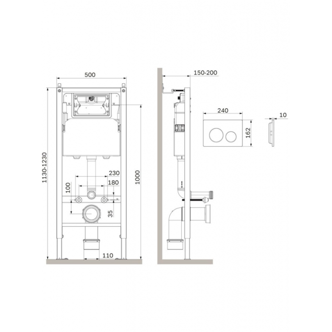 Инсталляция для подвесного унитаза бренда AM.PM коллекции PrimeFit с механическим управлением смыва включает в себя максимально полный комплект поставки: крепления, патрубки, звукоизолирующую прокладку, механическую двухрежимную клавишу смыва. Размер инсталляции(Ш/Г/В): 530x150-200x1130-1230 мм. Размер клавиши (Ш/Г/В): 240x10x162 мм. Цвет и материал: синий каркас из нержавеющей стали, белый бачок из ABS-пластика, механическая клавиша черная матовая. Форма кнопок: круглые.
