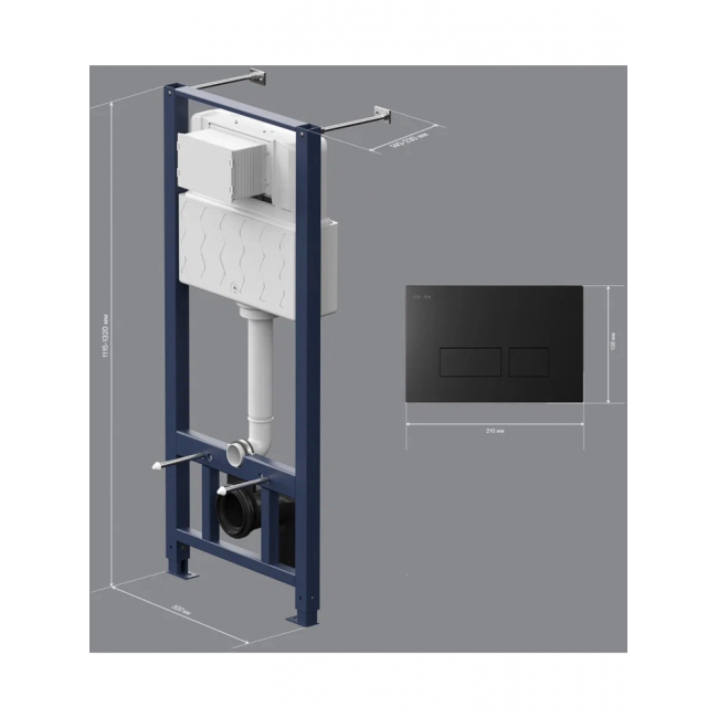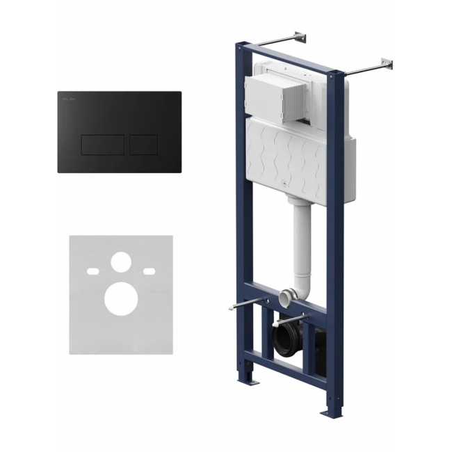 Инсталляция для подвесного унитаза бренда AM.PM коллекции Pro с пневматическим управлением смыва включает в себя максимально полный комплект поставки: крепления, патрубки, звукоизолирующую прокладку, пневматическую двухрежимную клавишу смыва. Размер инсталляции(Ш/Г/В): 530x140-230x1115-1320 мм. Размер клавиши (Ш/Г/В): 210x12x138 мм. Цвет и материал: синий каркас из нержавеющей стали, белый бачок из ABS-пластика, пневматическая черная клавиша. Форма кнопок: прямоугольные.