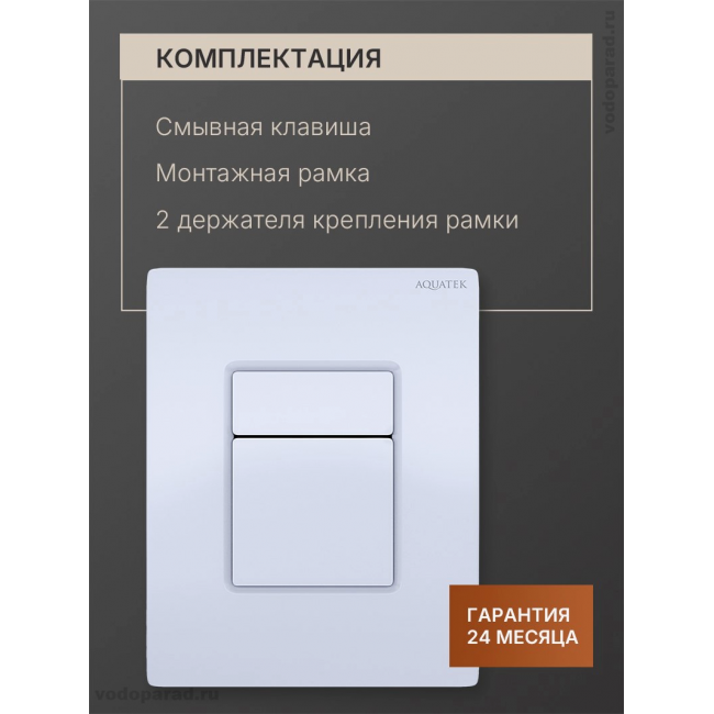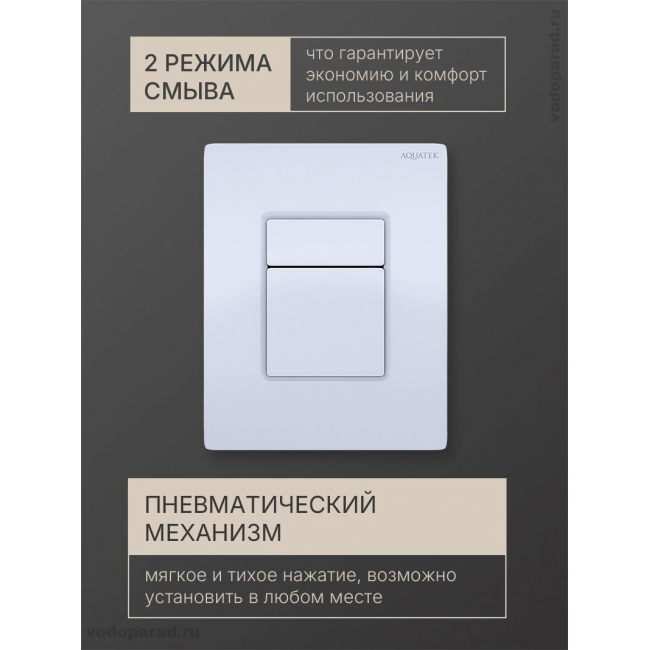 - Двойной регулируемый режим смыва – клавиша смыва Aquatek обеспечивает удобство использования и экономит ресурсы, позволяя контролировать расход воды