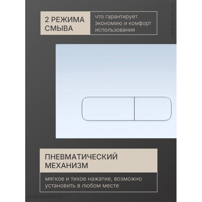 - Бесшумная работа – мягкий спуск воды без резких звуков, благодаря пневматическому механизму нажимается более плавно и тихо