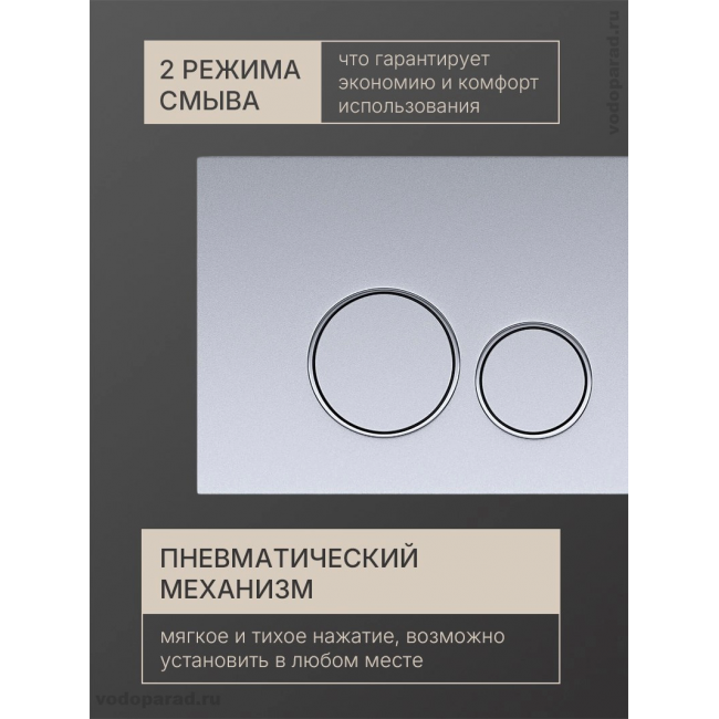 - Бесшумная работа – мягкий спуск воды без резких звуков, благодаря пневматическому механизму нажимается более плавно и тихо