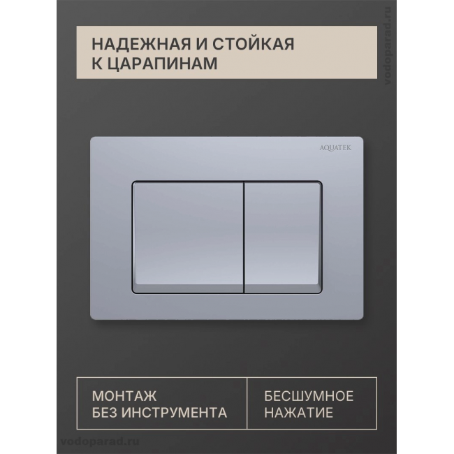 Смывная панель Aquatek представляет собой стильное и функциональное решение для вашей ванной комнаты. Супертонкая панель в цвете хром матовый Aquatek TDI-0000006 с квадратными клавишами смыва, соответствующая современным тенденциям, добавит изысканности любому интерьеру. Благодаря использованию высококачественных материалов, таких как прочный ABS-пластик, эта модель не только привлекательна внешне, но и долговечна.