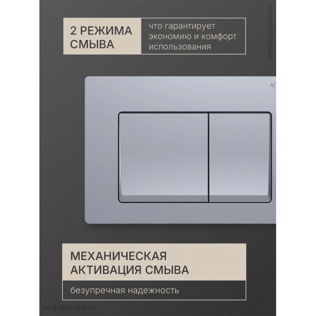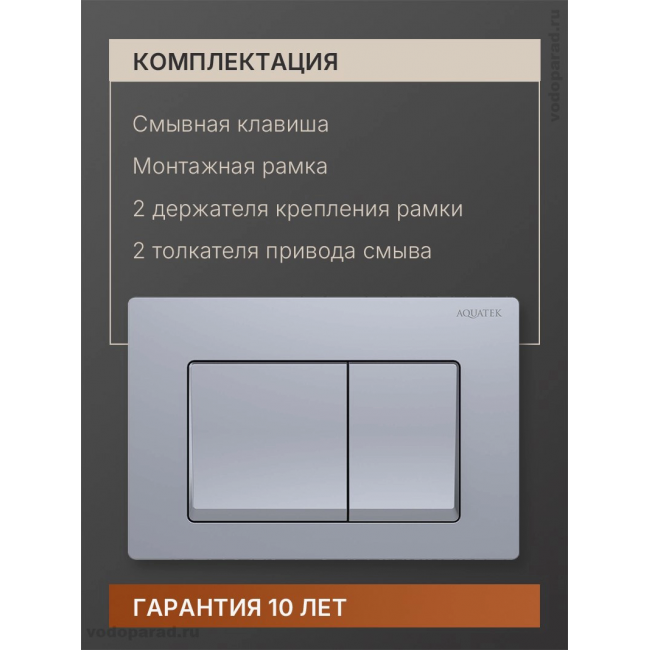Панель смыва Aquatek обеспечивает два режима слива воды, что гарантирует экономию и комфорт использования. Она совместима с бачками и инсталляциями Aquatek с верхним (горизонтальным) расположение панелей смыва и предназначена для механического управления как подвесными, так и напольными унитазами. Надежность и элегантный дизайн делают смывную панель Aquatek идеальным выбором для современного дома.