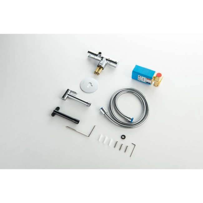 | Комплектация | 1. Смеситель для душа (внешняя и скрытая часть) 2. Душевой гарнитур: гигиеническая лейка, шланг, шланговое подсоединение с держателем 3. Декоративные накладки на стену из нержавеющей стали 2,5 мм |