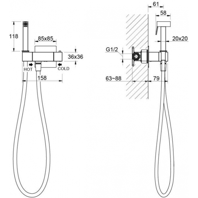 | Комплектация | 1. Смеситель для душа (внешняя и скрытая часть) 2. Душевой гарнитур: гигиеническая лейка, шланг, шланговое подсоединение с держателем 3. Декоративные накладки на стену из нержавеющей стали 2,5 мм |