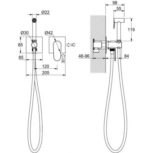 | Комплектация | 1. Смеситель для гигиенического душа (внешняя и скрытая часть) 2. Душевой гарнитур: гигиеническая лейка, шланг, шланговое подсоединение с держателем 3. Декоративные накладки на стену из нержавеющей стали 4 мм |