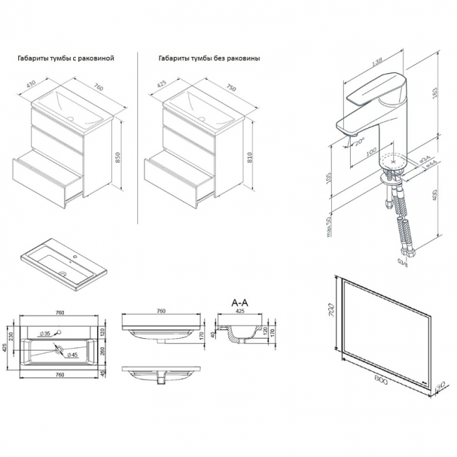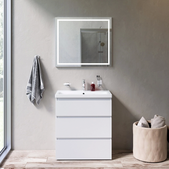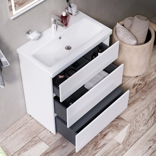 Современный европейский дизайн этого комплекта разработан престижным агентством DanelonMeroni (Великобритания/Италия). Уникальный нижний ящик мебельной тумбы может быть использован как: выдвижная подставка для детей для удобного мытья рук дополнительная ниша для хранения. Лаконичный дизайн зеркал Gem впишется в интерьер любой ванной комнаты. Усиленная LED-подсветка по периметру обеспечивает отличное рассеянное освещение и отсутствие теней. Срок службы светодиодов составляет более 30 000 часов. Комплект дополнен смесителем с узнаваемой шестигранной формой ручки которая сразу выделяется среди смесителей в доступном сегменте. Дерзкие и стильные формы аксессуаров превращают даже обыденные предметы в классные дизайнерские детали которыми хочется пользоваться каждый день. M91FSX0752WG База под раковину напольная M90WCC0752WG Раковина мебельная керамическая M91AMOX0801WG Зеркало настенное с контурной LED-подсветкой F90A02100 Смеситель для умывальника A9034300 Стеклянный стакан с настенным держателем A9034200 Стеклянная мыльница с настенным держателем A9035600 Двойной крючок для полотенец.