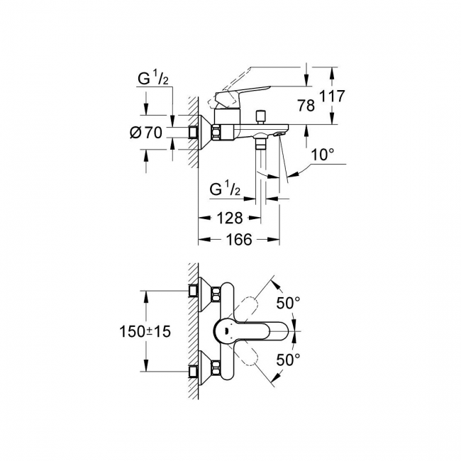 GROHE FastFixation (регулируемое расстояние междунастенными креплениями штанги позволяет использоватьдля монтажа уже имеющиеся отверстия в стене).