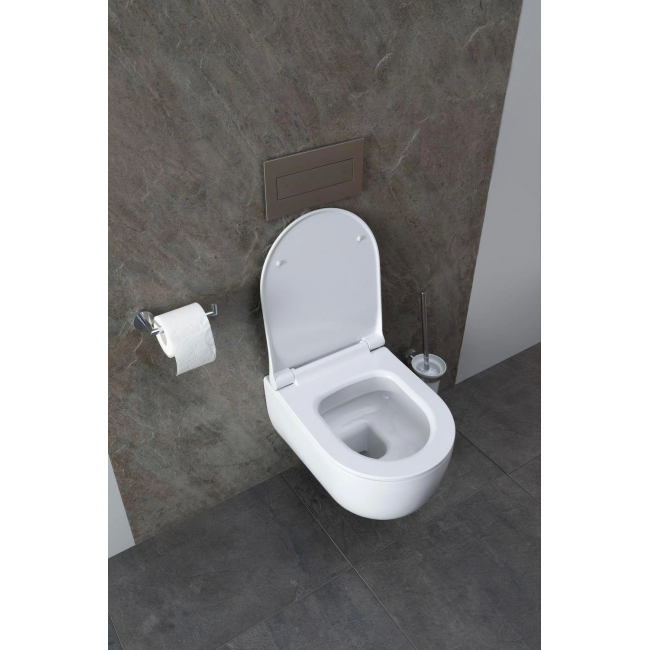 Унитаз с инсталляцией Allen Brau Priority — универсальный вариант с подвесной чашей без ободка и каскадным смывающим потоком. Монтируется конструкция прямо в стену, избавляя комнату от визуального мусора в виде коммуникаций. Сам унитаз занимает небольшое пространство у стены вместе с лаконичной кнопкой для пуска воды. В комплекте также имеется удобная крышка-сиденье в цвет изделию из дюропласта с функцией плавного опускания, то есть с микролифтом. Модель хорошо сочетается с любым цветом ванной комнаты, в том числе и с разной фактурой под древесину или камень. Что касается интерьера, то конструкция отлично смотрится в футуристических и минималистических направлениях.