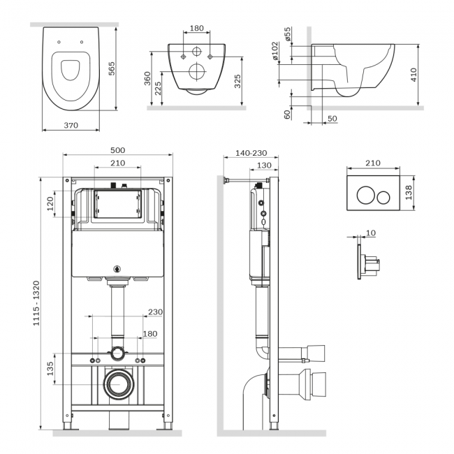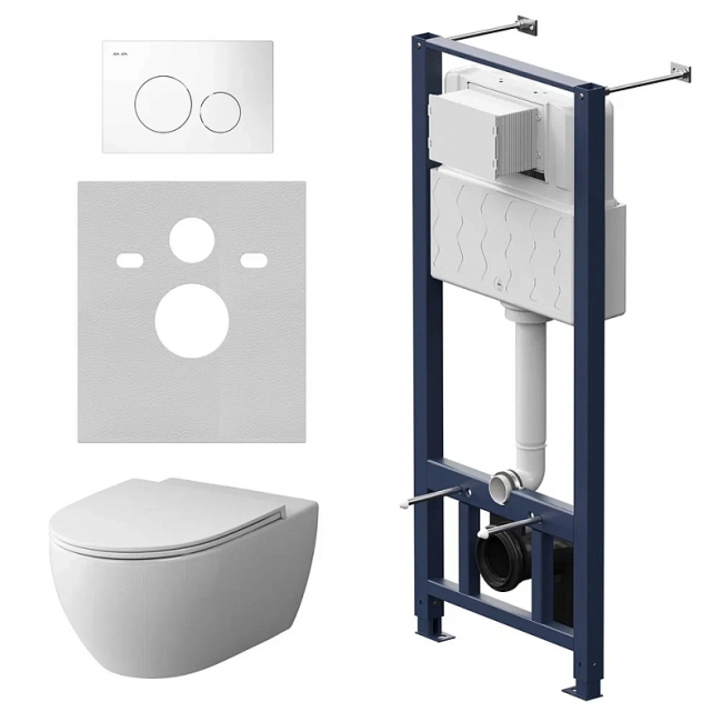 Полностью готовый к установке комплект: система инсталляции с клавишей подвесной унитаз с сиденьем. Неразборная рама из стального профиля выдерживает нагрузку до 400 кг. Полностью изолированный бачок с качественной двухрежимной смывной арматурой укомплектован пневматической клавишей в цвете белый. В комплекте все необходимые патрубки и крепления а также прокладка между унитазом и стеной - звукоизоляция.