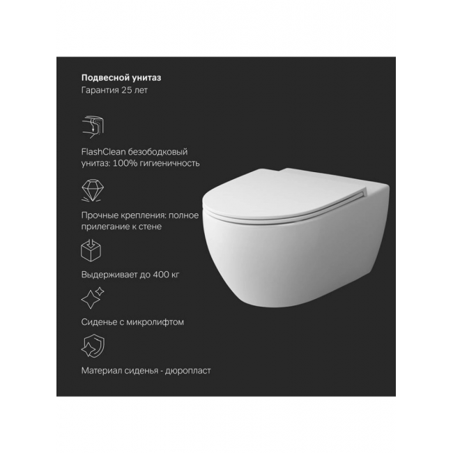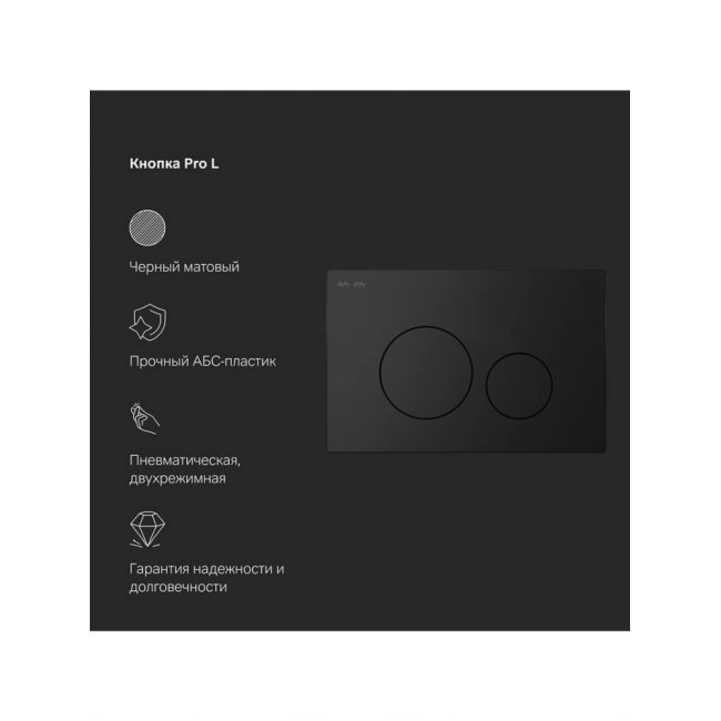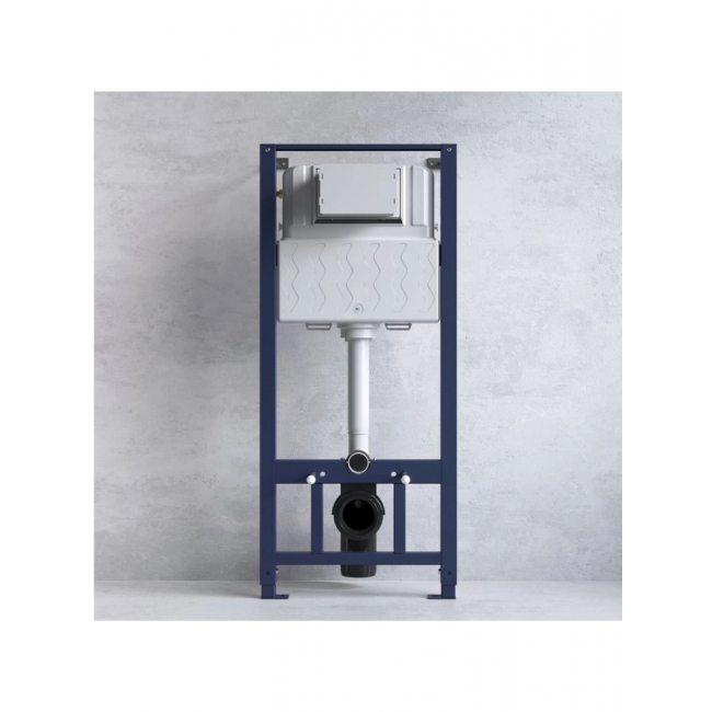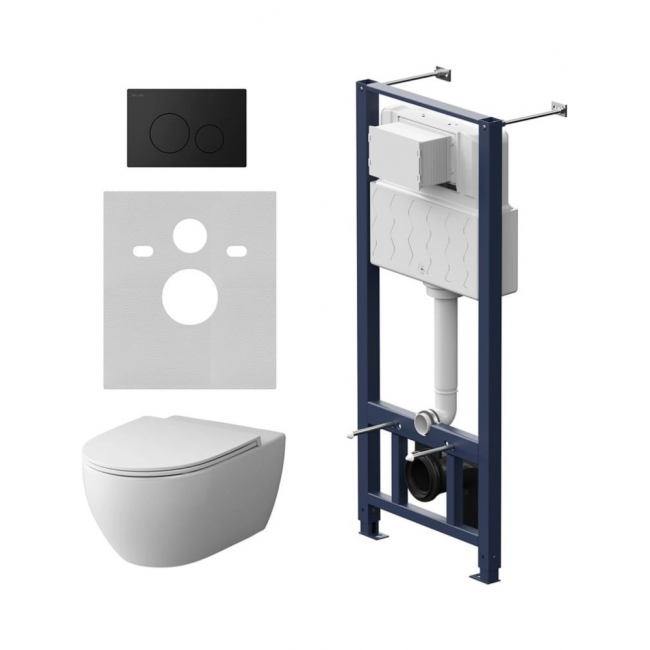 Полностью готовый к установке комплект: система инсталляции с клавишей, подвесной унитаз с сиденьем. Неразборная рама из стального профиля выдерживает нагрузку до 400 кг. Полностью изолированный бачок с качественной двухрежимной смывной арматурой укомплектован пневматической клавишей в черном матовом цвете. В комплекте все необходимые патрубки и крепления, а также прокладка между унитазом и стеной - звукоизоляция.
