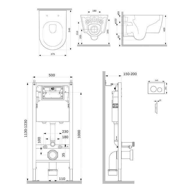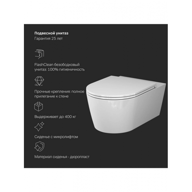 Полностью готовый к установке комплект: система инсталляции с клавишей, подвесной унитаз с сиденьем, включающий все необходимые крепления, патрубки, звукоизолирующую прокладку.