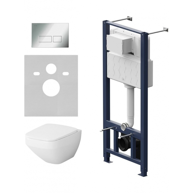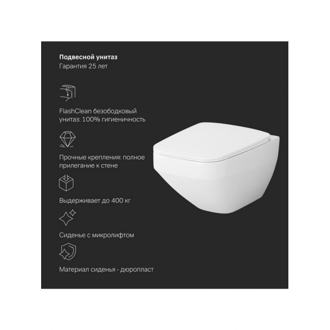Полностью готовый к установке комплект: система инсталляции с клавишей подвесной унитаз сиденьем. Неразборная рама из стального профиля выдерживает нагрузку до 400 кг. Полностью изолированный бачок с качественной двухрежимной смывной арматурой - комфортное использование благодаря низкому уровню шума - менее 20 дБ. Укомплектован пневматической клавишей в цвете глянцевый хром. В комплекте все необходимые патрубки и крепления, а также прокладка между унитазом и стеной - звукоизоляция. Современный дизайн и новая квадратная форма в керамике АМ.РМ. FlashClean — новое поколение безободковых унитазов без использования пластика: 100 % гигиеничности 0% брызг. Безупречная поверхность: изготовлен из стекловидного фарфора самого гигиеничного и влагостойкого материала с использованием форм последнего поколения. В комплекте быстросъемное сиденье из Дюропласта с функцией микролифт. Актуальный дизайн сиденья slim с однокнопочным механизмом быстрого снятия.