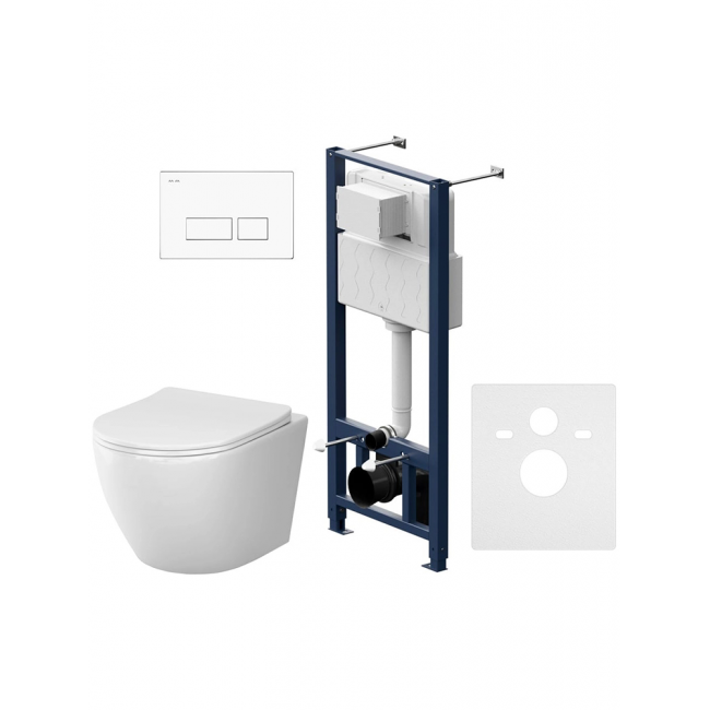 Полностью готовый к установке комплект: система инсталляции с клавишей подвесной унитаз с сиденьем. Неразборная рама из стального профиля выдерживает нагрузку до 400 кг.