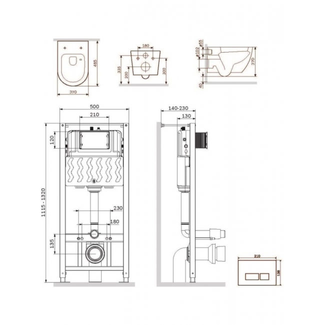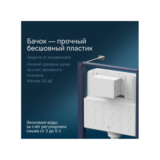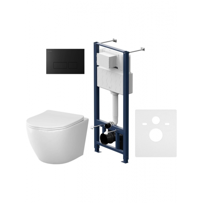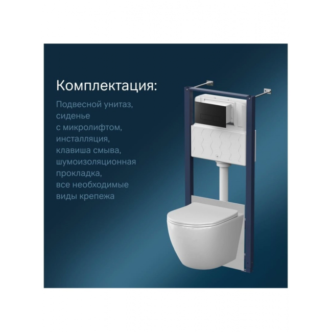 Полностью готовый к установке комплект: система инсталляции с клавишей, подвесной унитаз с сиденьем. Неразборная рама из стального профиля выдерживает нагрузку до 400 кг. Полностью изолированный бачок с качественной двухрежимной смывной арматурой укомплектован пневматической клавишей в цвете черный матовый. В комплекте все необходимые патрубки и крепления, а также прокладка между унитазом и стеной - звукоизоляция.