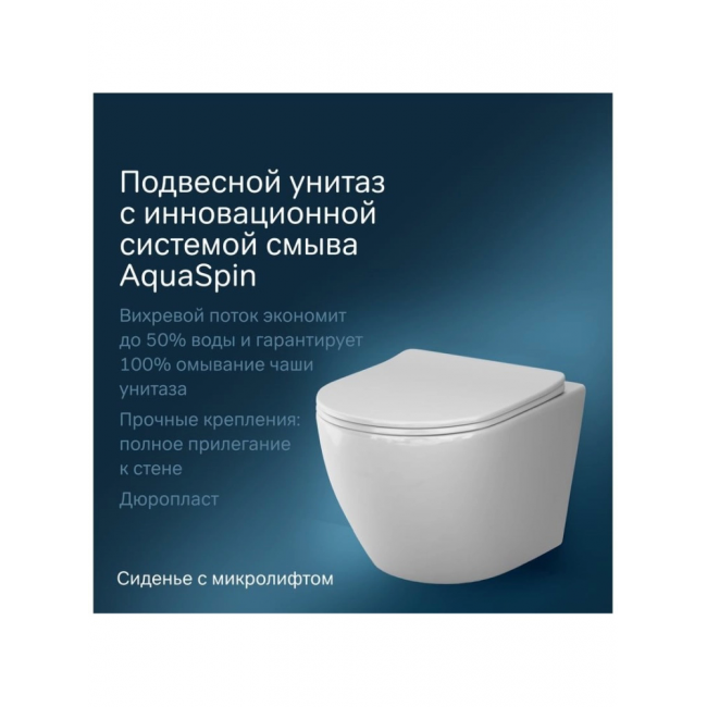 Подвесной унитаз Like c технологией смыва AquaSpin. Новая инновационная система использует вихревой поток воды для самого эффективного очищения чаши унитаза. Эта технология обеспечивает более качественное омывание чаши, чем традиционные системы смыва, и при этом экономит воду до 50 %.