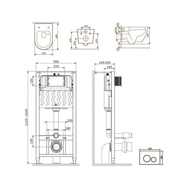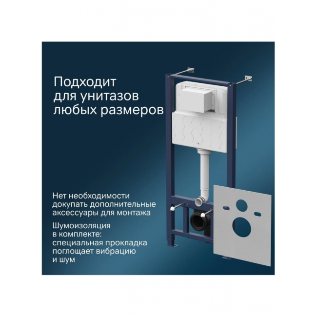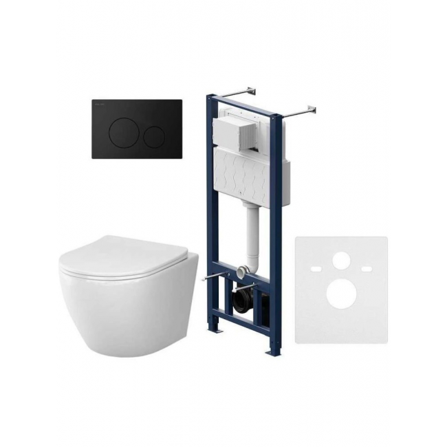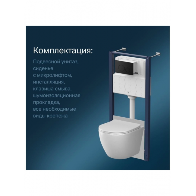 Полностью готовый к установке комплект: система инсталляции с клавишей, подвесной унитаз с сиденьем. Неразборная рама из стального профиля выдерживает нагрузку до 400 кг. Полностью изолированный бачок с качественной двухрежимной смывной арматурой укомплектован пневматической клавишей в цвете глянцевый хром. В комплекте все необходимые патрубки и крепления, а также прокладка между унитазом и стеной - звукоизоляция.