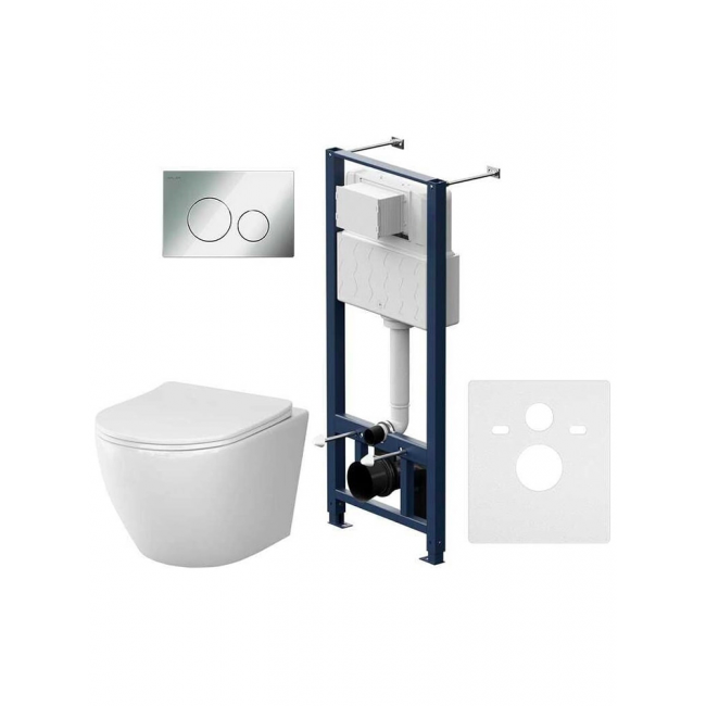Полностью готовый к установке комплект: система инсталляции с клавишей подвесной унитаз с сиденьем. Неразборная рама из стального профиля выдерживает нагрузку до 400 кг.