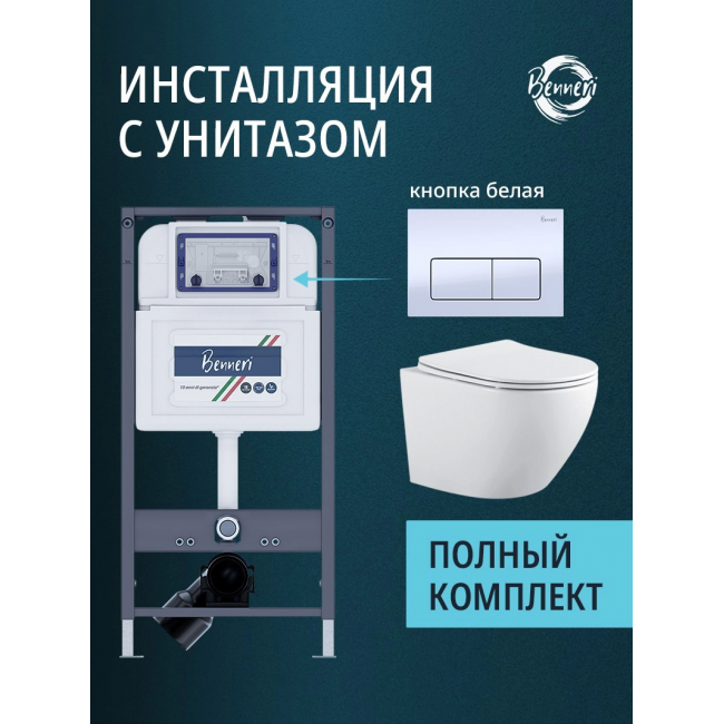 Комплект унитаз с инсталляцией, кнопкой и сиденьем микролифт Benneri Европа B4.54.015A.AQ1901 безободковый купить с доставкой. 100% Оригинал. Гарантия!