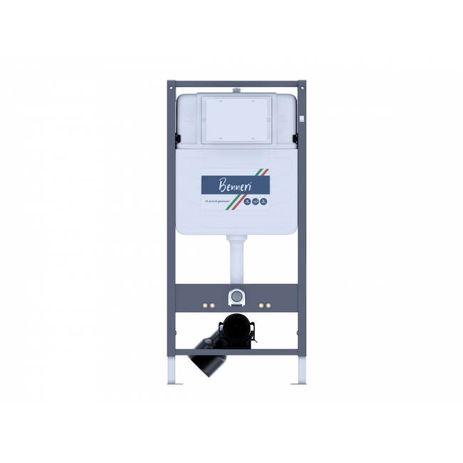 - инсталляции Benneri BE.53113.01. Это прочная монтажная рама из стального профиля 40*40 мм толщиной 1.5 мм и шириной 53 см, с усиленной траверсой толщиной 3мм. Инсталляция способна выдерживать нагрузку более 400 кг. Цельнолитой бачок скрытого монтажа, обшитый кожухом из пенопласта, защищает от конденсата и исключает возможность проточек.