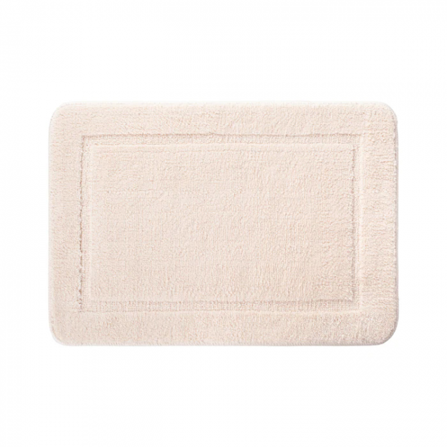 Мягкий коврик для ванной светло-бежевого цвета с плотным невысоким ворсом (1 см), очень приятный на ощупь. Ворс из микрофибры отлично держит форму, легко чистится и быстро сохнет.