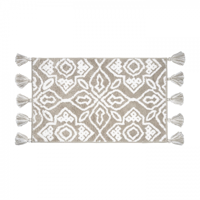 Мягкий бежевый коврик для ванной с декоративными пушистыми кисточками и белым узором, очень приятный на ощупь. Ворс из микрофибры отлично держит форму, легко чистится и быстро сохнет. Коврик подойдет для ванной и туалета, а также поможет создать уют в спальне или гостиной.• Коврик противоскользящий: основа из экологичной термопластичной резины (TPR) позволяет не скользить на гладком и влажном кафеле. Подходит для использования в помещениях с теплыми полами. • Благодаря современным влагостойким материалам и качественной обработке краев коврик не потеряет яркости красок, не обветшает и надолго останется привлекательным как в день покупки.• Рекомендуется ручная стирка при температуре до 40 градусов с жидким моющим средством; не сушить на батарее, избегать солнечных лучей.