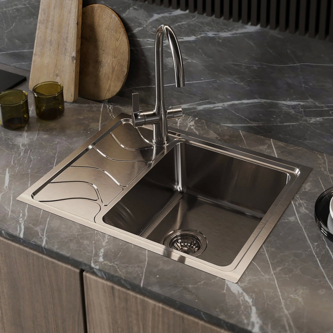 Оригинальный рисунок крыла моек в коллекции Reeva напоминает речные волны. Исключительно малый радиус закругления углов и увеличенная глубина прямоугольной чаши 210 мм позволяют вместить даже габаритную посуду. Модель подойдет к большинству современных кухонных гарнитуров и тумб от 50 см. Слева мойка оснащена крылом – на нем удобно сушить вымытую посуду, овощи или фрукты. Мойка Reeva имеет текстуру с эффектом шелковой поверхности благодаря специальной обработке стали. Это придает мойке современный технологичный вид. Качественная нержавеющая сталь толщиной 0,9 мм обеспечивает надежность, ударопрочность мойки и ее стойкость к износу. Специальное антишумовое покрытие и полимерные накладки на оборотной стороне чаши снижают шум при использовании мойки. Мойка полностью готова к установке, все необходимое для монтажа есть в комплекте: крепеж, эластичная уплотнительная лента, которая защитит периметр мойки от протечек. Гарантия на мойку Reeva – 15 лет.