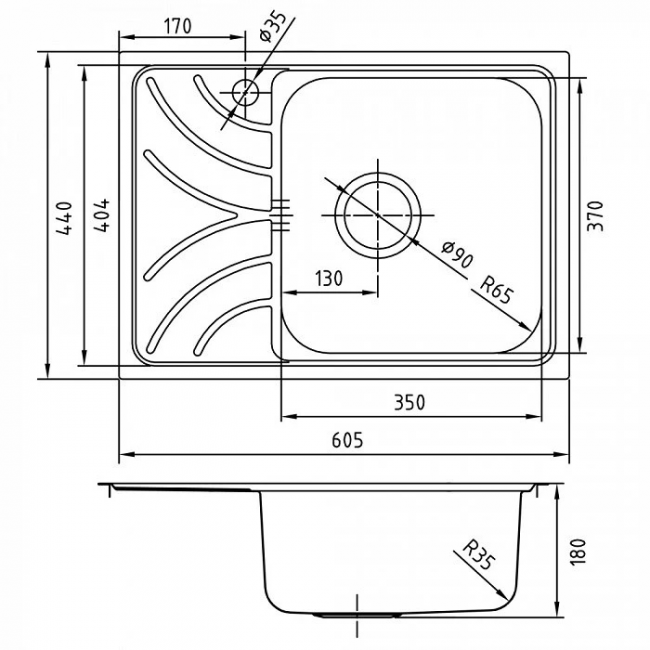 Комплектация: уплотнительная прокладка, крепления; Размер мойки: 605х440 мм; Сталь: нержавеющая, 0,8 мм; Ширина шкафа: от 45 см; Глубина чаши: 180 мм