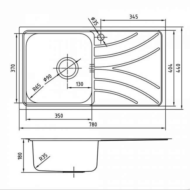 Комплектация: уплотнительная прокладка, крепления; Размер мойки: 780х440 мм; Сталь: нержавеющая, 0,8 мм; Ширина шкафа: от 45 см; Глубина чаши: 180 мм