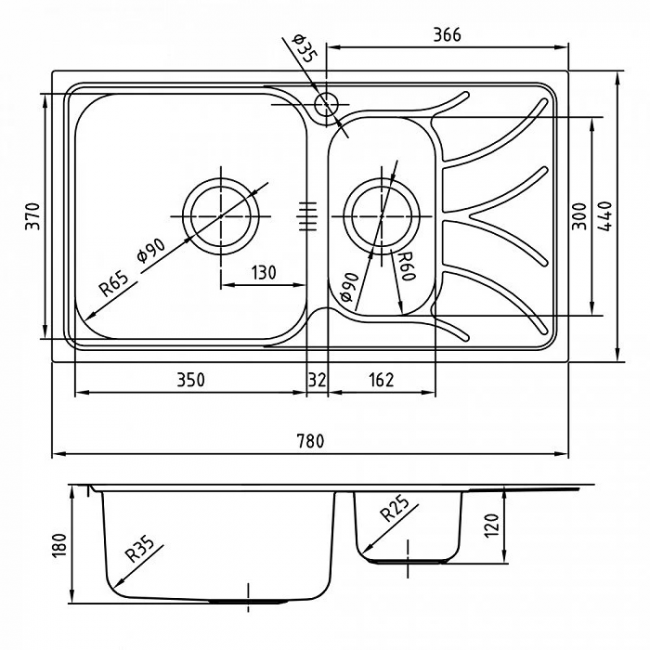 Комплектация: уплотнительная прокладка, крепления; Размер мойки: 780х440 мм, полуторная; Сталь: нержавеющая, 0,8 мм; Ширина шкафа: от 60 см; Глубина чаши: 180 мм