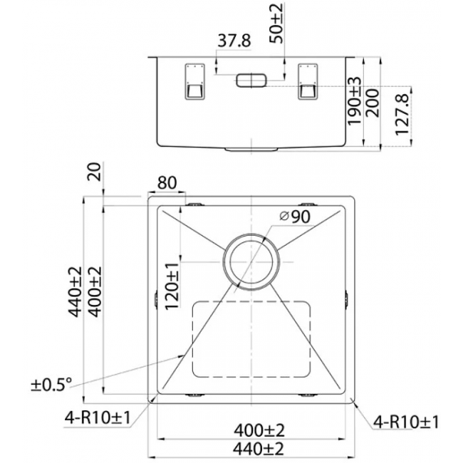 Мойка, нержавеющая сталь, марки AISI 304, поверхность матовая. Размер: 440х440 мм, глубина 200 мм. Ширина шкафа: от 50 см В комплекте: механический выпуск, крепления