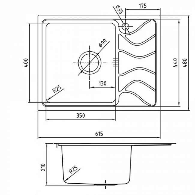 Комплектация: уплотнительная прокладка, крепления; Размер мойки: 615х480 мм; Сталь: нержавеющая, 0,9 мм; Ширина шкафа: от 45 см; Глубина чаши: 210 мм; Радиус закругления чаши: 25 мм